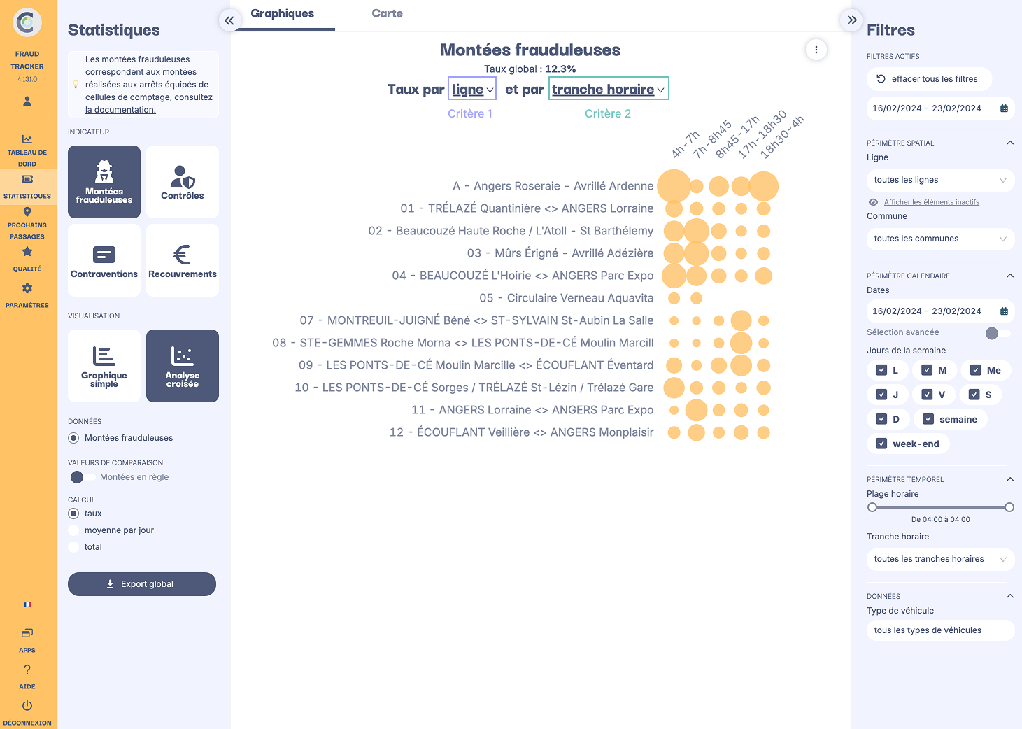 Le critère 1, affiché à l'horizontale, sur la gauche de l'analyse croisée, est lié aux éléments du réseau. Les éléments disponibles pour ce critère 1 varient en fonction de l'indicateur sélectionné (ex. : Fraude, Contrôles...) et des filtres activés (ex. : ligne 01, direction 2...). Le critère 2, affiché en haut des analyses croisées, est un critère temporel.
