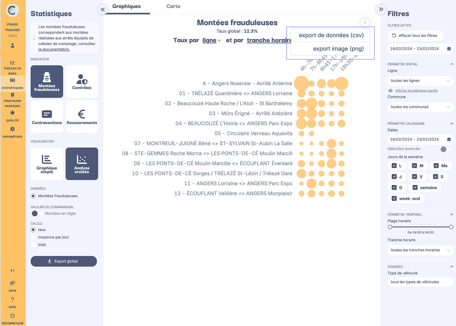 - Critère 2 : Par tranche horaire. Il est possible de modifier les tranches horaires affichées via le menu des filtres à droite (ici, toutes les tranches horaires sont sélectionnés).